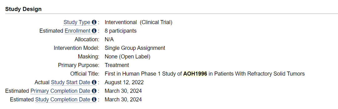 在上述积极终端的布景下,但愿城市现已开展1期临床磨真金不怕火。凭据 ClinicalTrials.gov公布的信息,该磨真金不怕火照旧在2022年8月运行,主要临床极端是细则AOH1996的最大耐受剂量(MTD)和剂量罢休性毒性(DLT),针对的患者群体是对养息无反映(难治性)的实体瘤患者,预测入组东说念主数8名,预测探讨完成本领是2024年3月30日。